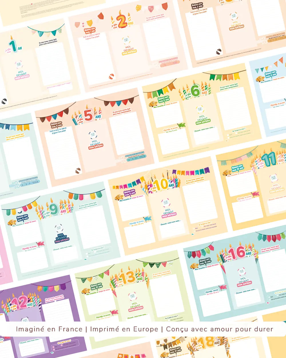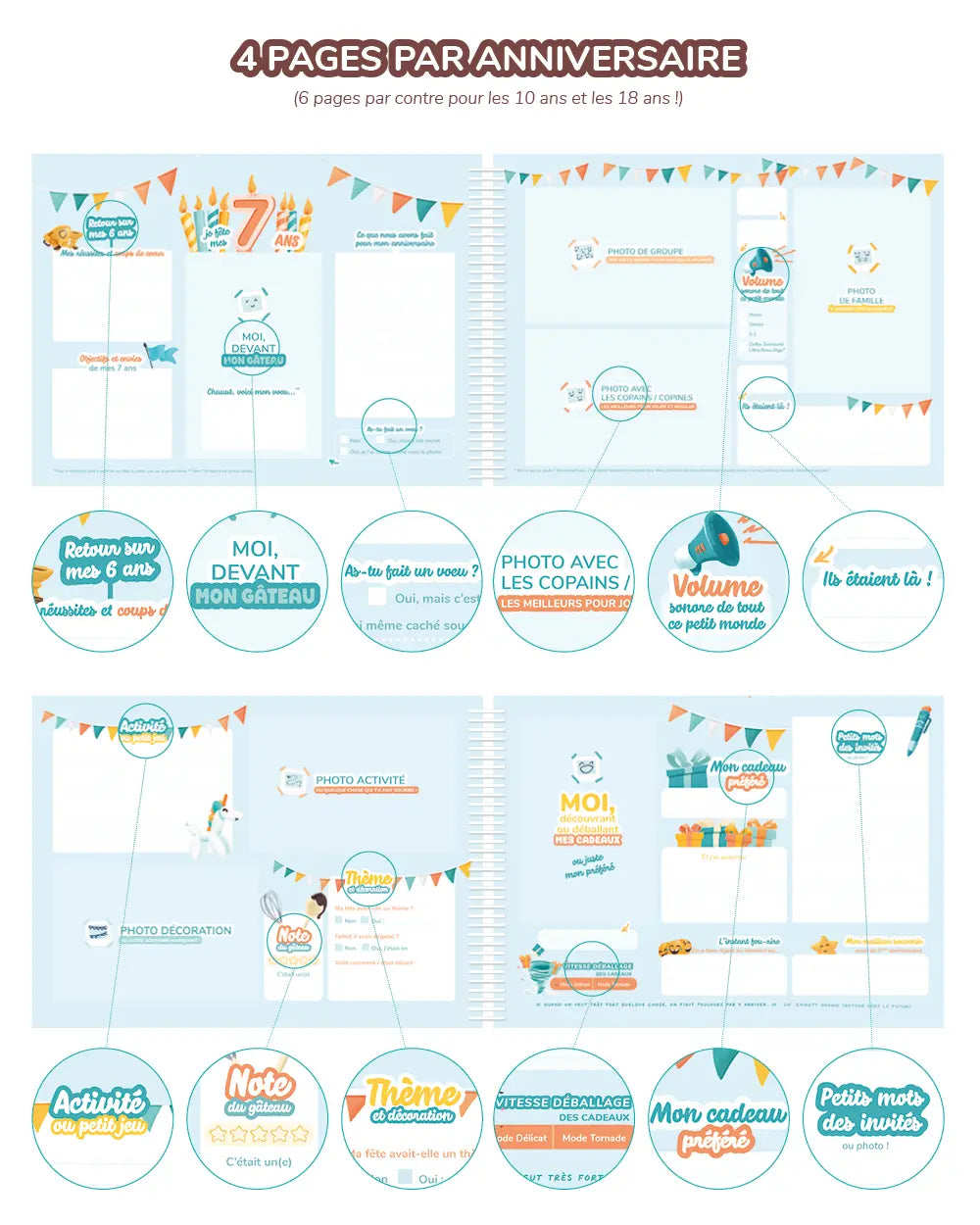 📅 18 ANNIVERSAIRES : de sa toute première bougie à sa grande fête des 18 ans, consignez les moments forts pour chaque année.