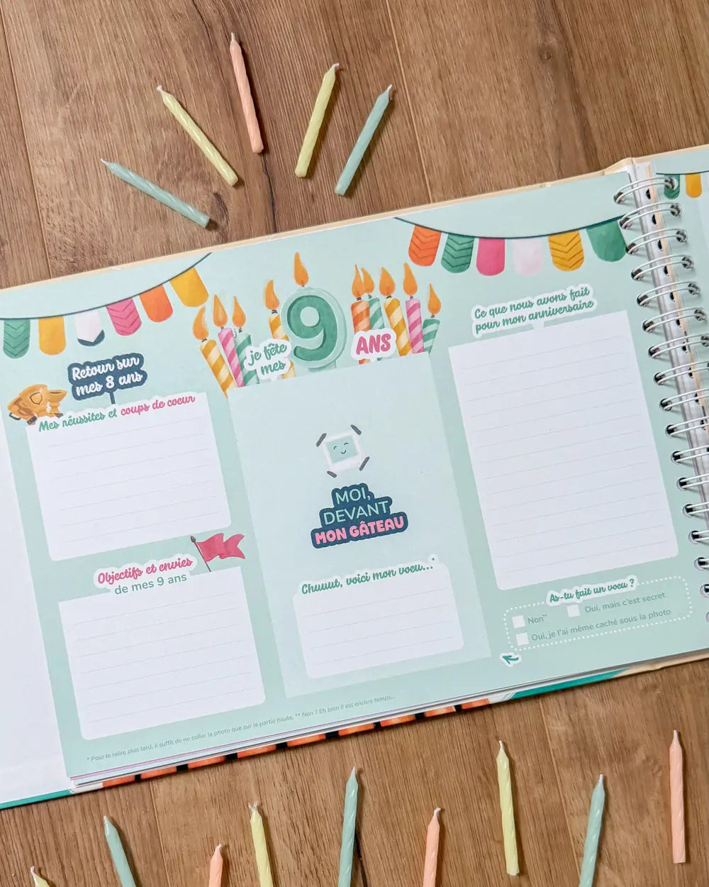 Des rubriques évolutives à compléter chaque année : cadeaux préférés, gâteau de l’année, activités marquantes, envie pour l’année suivante... le tout dans un ton tendre et amusant.